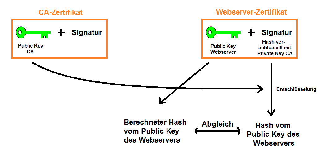 1. Der Browser nimmt aus dem Webserver-Zertifikat den Hash, der mit dem privaten Schlüssel der CA verschlüsselt ist und entschlüsselt diesen mit dem vorhandenen öffentlichen Schlüssel der CA.